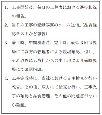 b.元請け業者は、前の表にある③出来形・品質管理④完成検査の要件を満たす為に、下請け業者から下記の報告を受けるものとする。また、申し出により現場にて確認・指導業務を行う。