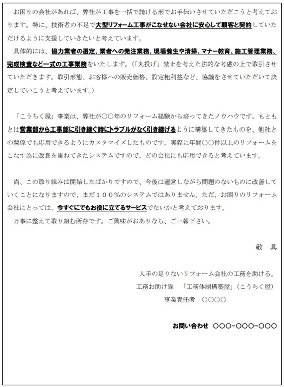 特に、少人数で運営するリフォーム会社では、営業、工事、会社運営において業務改善を課題にしている会社は多いので、工務力をもった会社を下請けにすることで、勉強にもなるはずである。